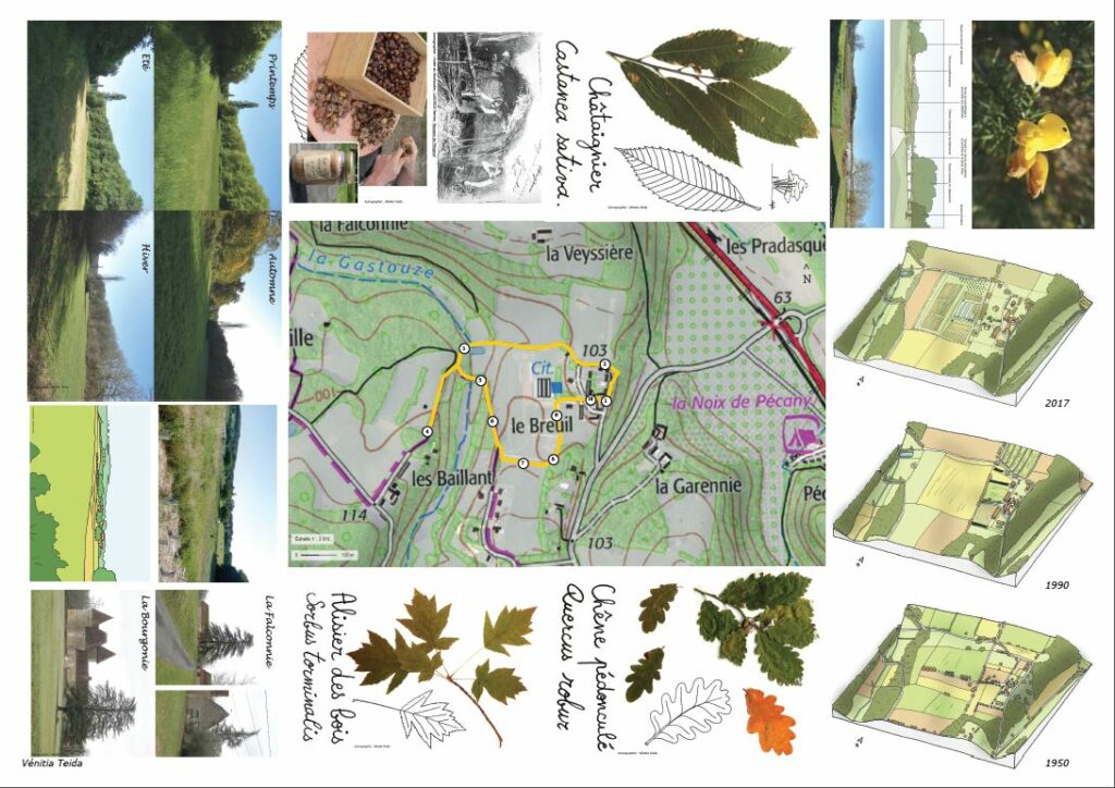 Nous explorerons ensemble une partie de la ferme et des espaces cultivés et forestiers, pour parcourir des paysages variés et complémentaires. Aux arrêts thématiques, nous étudierons le territoire avec un peu d’histoire locale, des regards sur la nature, l’agriculture, l’architecture et le dessin, mais aussi les couleurs et les sonorités…